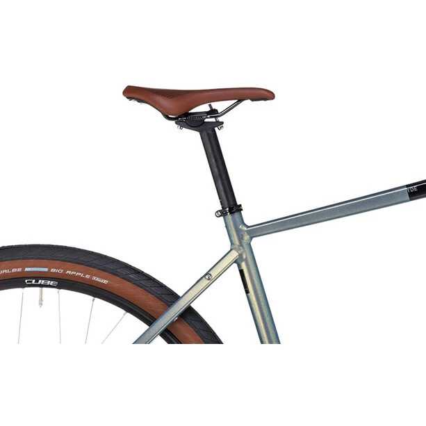 Bei der Entwicklung des Hyde hat CUBE sich an ihren 29er-Hardtails orientiert. Doppelt konifizierte Aluminiumrohrsätze bilden demnach eine stabile, langlebige, leichte und agile Rahmenstruktur, die dank nahtlos integrierter Montagepunkte die individuelle Nachrüstung mit Gepäckträger und Schutzblechen ermöglicht. Über das Exzenter Tretlager kann der überaus wartungsarme Zahnriemen gespannt werden – eingefädelt wird selbiger durch das kaum erkennbare, zu öffnende Ausfallende. Schließlich komplettiert eine schlanke, steife Gabel den Rahmen, ihr Spezialgebiet: ein knackiges, präzises Lenkverhalten in Kombination mit wenig Gewicht und einem eleganten Look.