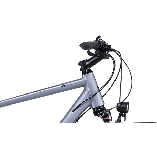 Das Nature EXC Allroad ist ein echtes Universalgenie und fühlt sich bei wochenendlichen Erkundungstouren abseits der gekennzeichneten Routen ebenso wohl wie auf den Straßen der Großstadt. Draußen in der Natur profitiert man vom Komfort der einfach einstellbaren Suntour Luftfedergabel, die sämtliche Schlaglöcher und Buckel auf der Strecke geschmeidig abdämpft. Außerdem vom weiten Übersetzungsbereich der Shimano 3×10-fach Schaltung und von den leistungsstarken, gleichmäßig und kontrolliert verzögernden hydraulischen Scheibenbremsen. Nicht nur in der City leisten der robuste Gepäckträger, Schutzbleche, der praktische Seitenständer und das integrierte Lichtsystem erstklassige Dienste.