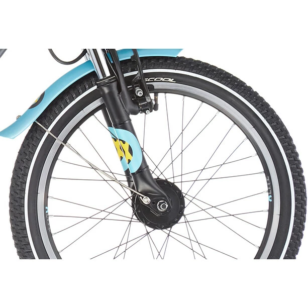 Für einen langanhaltenden Fahrspaß sorgt ein stabiler Stahlrahmen und eine Federgabel. Griffige Felgenbremsen an Vorder- und Hinterrad arbeiten zuverlässig, wenn es notwendig wird. Die leicht profilierten 20 Zoll Reifen sorgen für ausreichend Traktion auf unterschiedlichen Untergründen. Hinzu kommt eine Straßenverkehr taugliche Ausstattung mir Vorder- und Rücklicht, alle benötigten Reflektoren sowie Schutzblechen und Klingel.