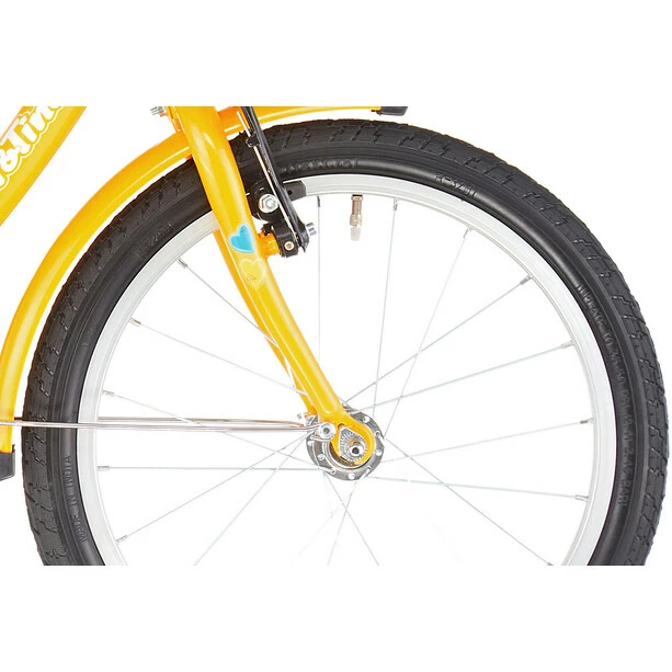 Die solide Bauweise des Kinderrades sorgt für größtmögliche Sicherheit. Neben einem Rahmen mit tiefem Einstieg verfügt es über stabile Aluminiumfelgen, Rücktritt- und Vorderradbremse mit kindgerechtem Bremshebel sowie einem Vorbaupolster. Außerdem sorgen Reflektoren an der Front, den Pedalen und am Gepäckträger für mehr Sichtbarkeit. Eine Klingel ist natürlich auch mit an Bord.